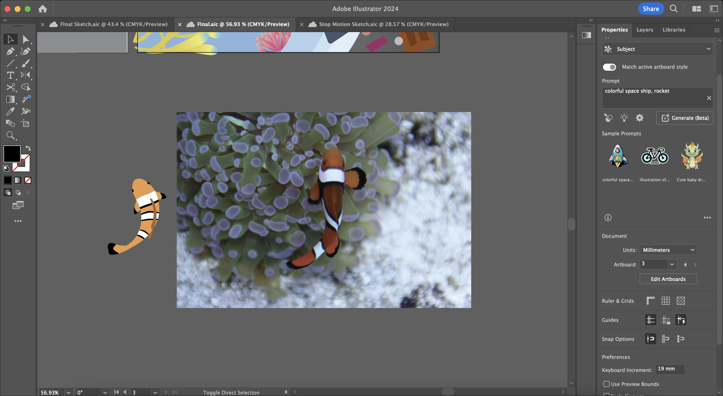 I did my further development in Adobe Illustrator. I was thinking to draw some marine creatures and print it out, then stick them with the plastic pieces to create a mixed media artwork. Some of the fishes and corals are below and some are above from the plastics.